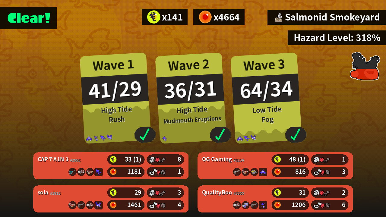 | Weapons | Jet Squelcher Blaster Hydra Splatling | N-ZAP '85 Hydra Splatling Dread Wringer | Blaster Glooga Dualies N-ZAP '85 | Hydra Splatling N-ZAP '85 Blaster |