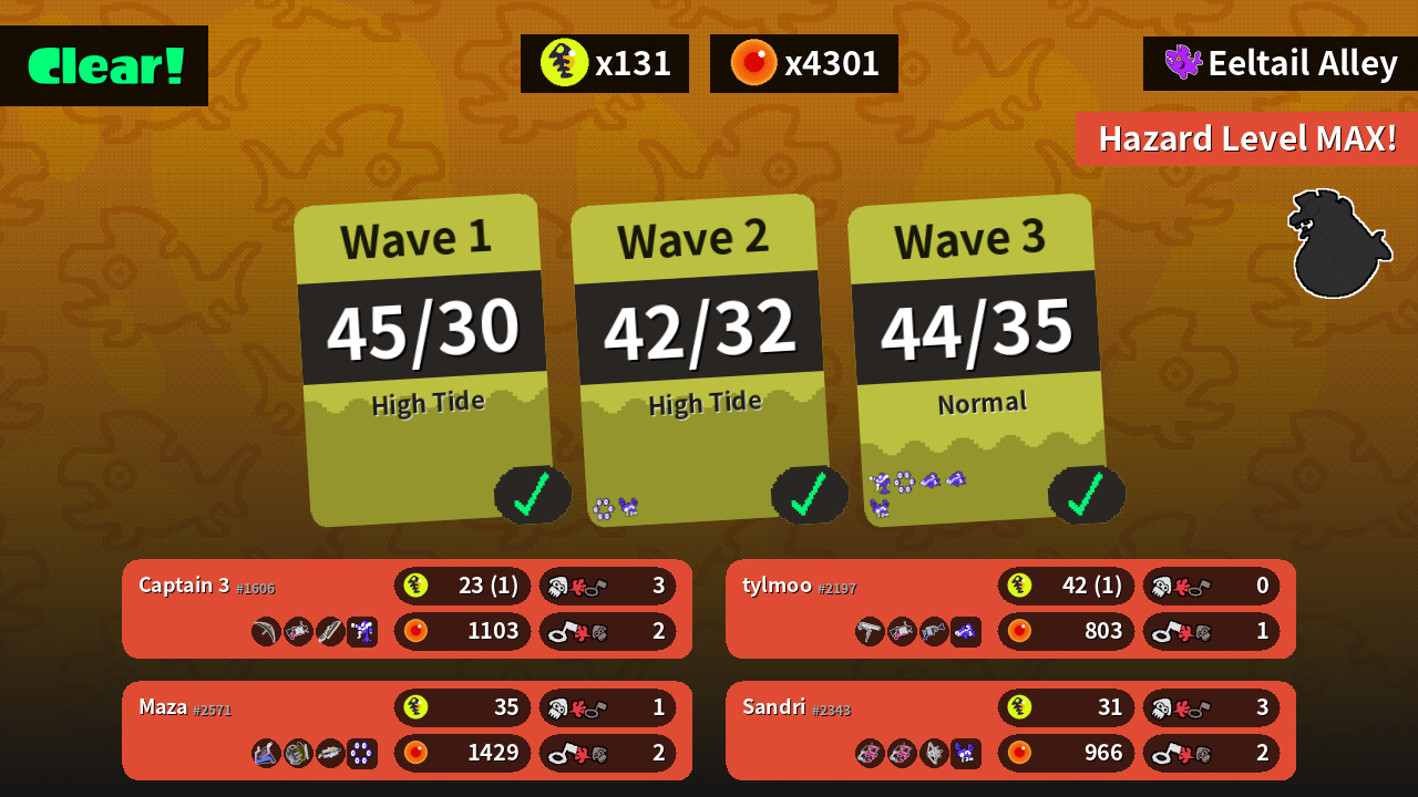 | Weapons | Tenta Brella .52 Gal Splatana Wiper | Dynamo Roller .52 Gal H-3 Nozzlenose | Slosher Grizzco Slosher Grizzco Brella | Dapple Dualies Dapple Dualies Tri-Stringer |