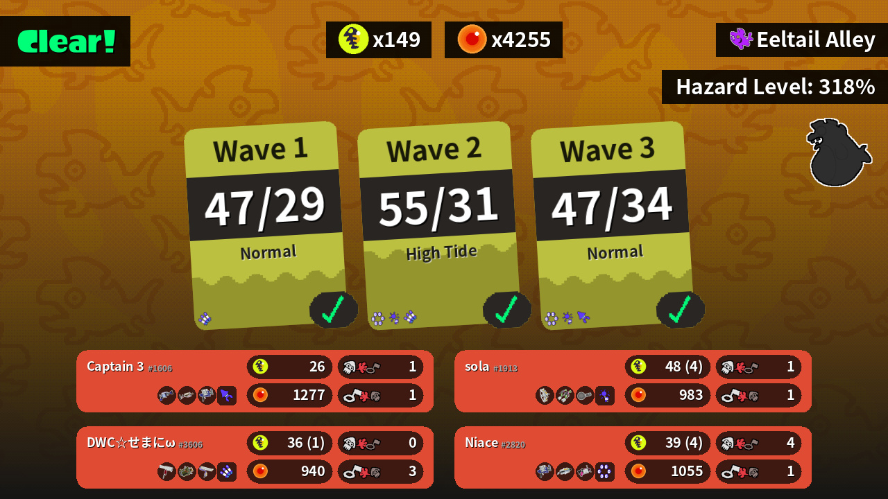 | Weapons | H-3 Nozzlenose Grizzco Charger Clash Blaster | Grizzco Stringer Splat Dualies Nautilus 47 | Clash Blaster Grizzco Brella .52 Gal | Flingza Roller Explosher Splat Roller |