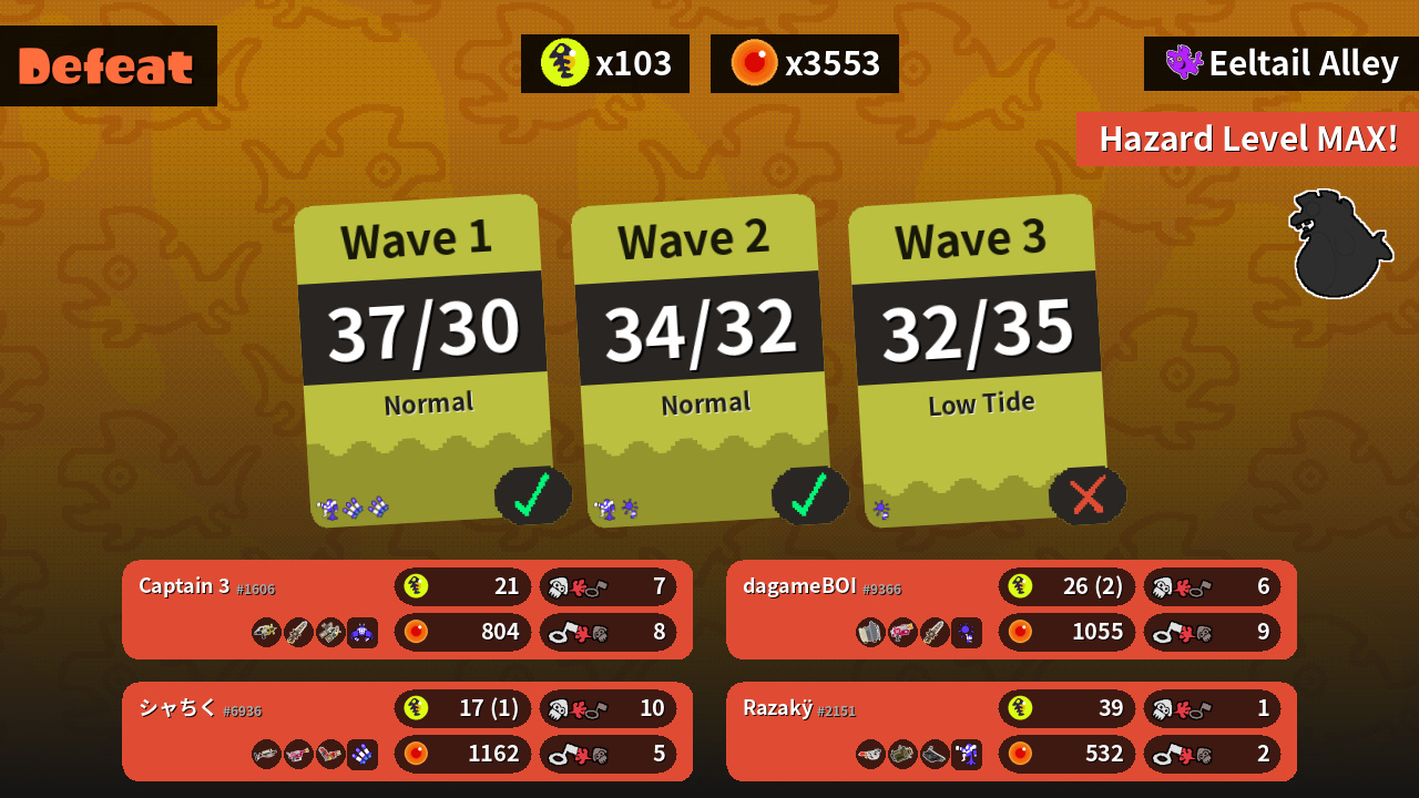 | Weapons | Splash-o-matic Grizzco Splatana Grizzco Dualies | Goo Tuber Explosher Bloblobber | Sloshing Machine Rapid Blaster Grizzco Splatana | Grizzco Charger Rapid Blaster Pro Hydra Splatling |