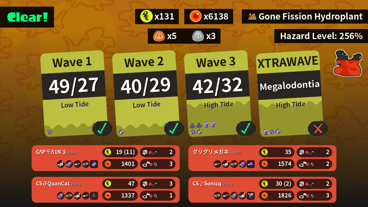 | Weapons | Luna Blaster Glooga Dualies E-liter 4K Splattershot Nova | Glooga Dualies Splattershot Nova Luna Blaster E-liter 4K | E-liter 4K Luna Blaster Splattershot Nova Glooga Dualies | Splattershot Nova E-liter 4K Glooga Dualies Luna Blaster |