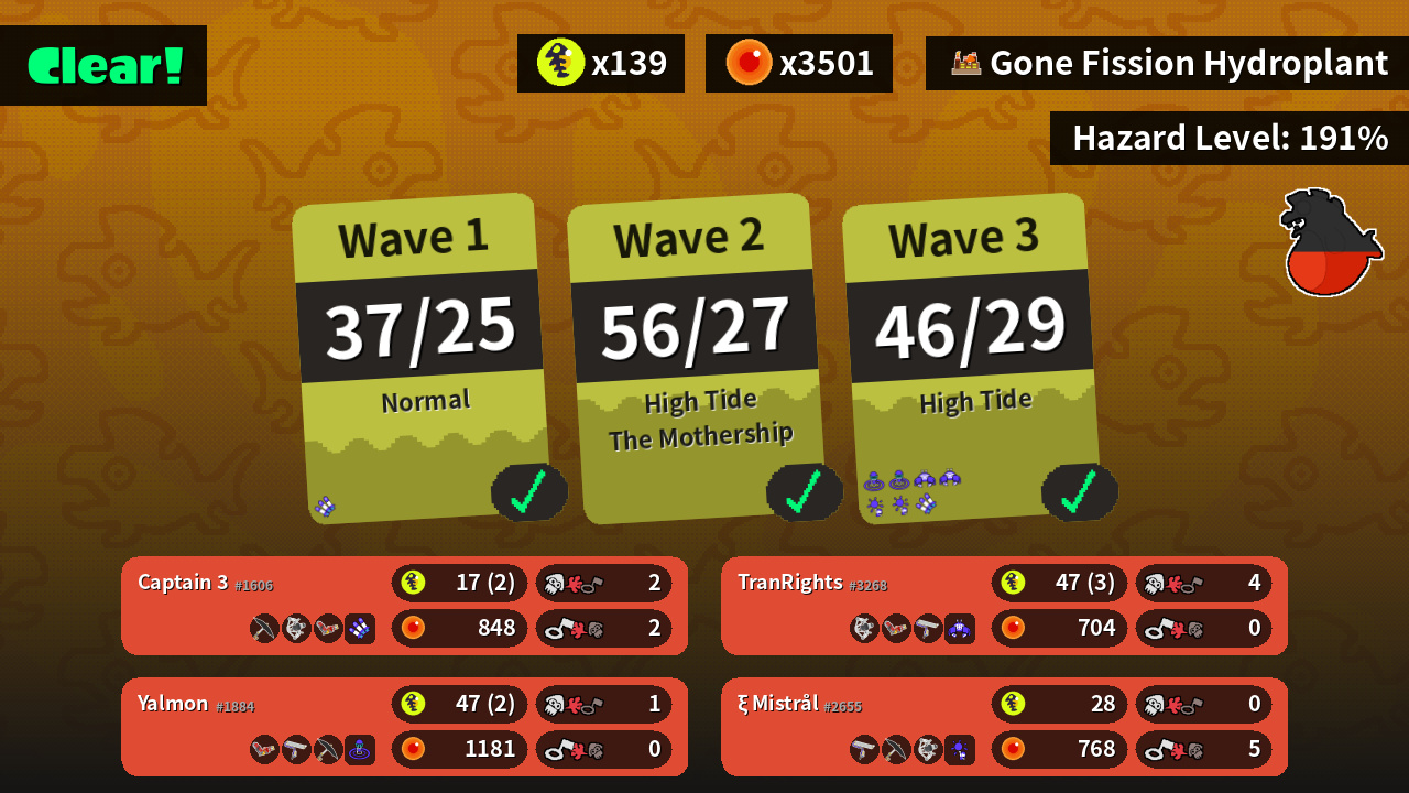 | Weapons | Undercover Brella REEF-LUX 450 Hydra Splatling | Hydra Splatling Splat Roller Undercover Brella | REEF-LUX 450 Hydra Splatling Splat Roller | Splat Roller Undercover Brella REEF-LUX 450 |