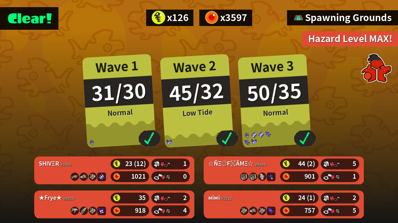 | Weapons | Grizzco Charger Grizzco Blaster Grizzco Dualies | Grizzco Slosher Grizzco Slosher Grizzco Stringer | Grizzco Roller Grizzco Splatana Grizzco Dualies | Grizzco Dualies Grizzco Blaster Grizzco Dualies |