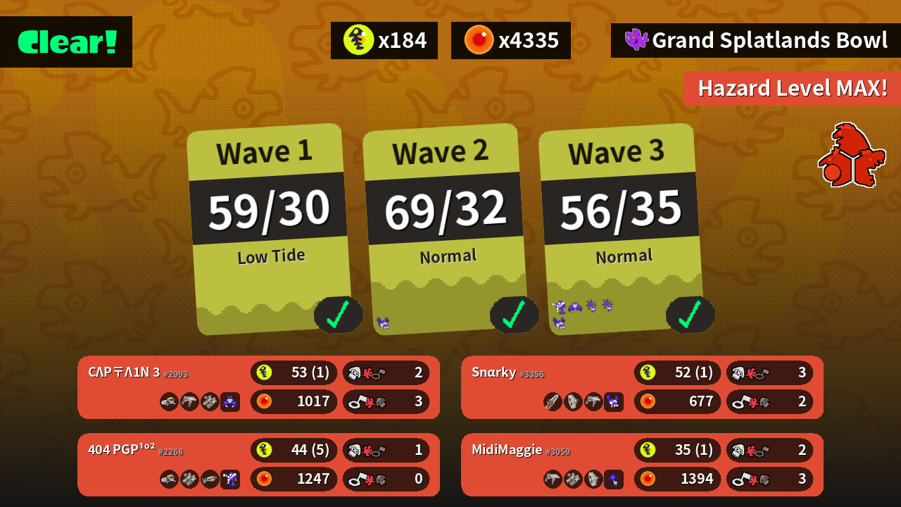 | Weapons | Grizzco Blaster Grizzco Roller Grizzco Dualies | Grizzco Splatana Grizzco Stringer Grizzco Roller | Grizzco Blaster Grizzco Dualies Grizzco Charger | Grizzco Roller Grizzco Dualies Grizzco Stringer |