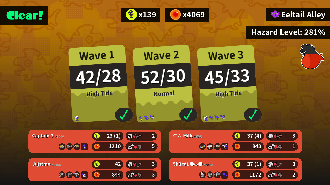 | Weapons | Dread Wringer Nautilus 47 Splash-o-matic | Squeezer Aerospray MG Splat Roller | Grizzco Stringer Grizzco Dualies Clash Blaster | Mini Splatling Splattershot Jr. Sploosh-o-matic |