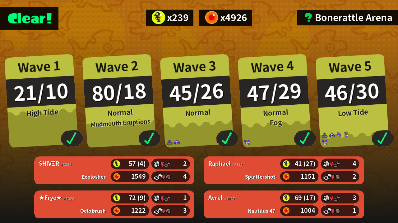 | Weapons | Explosher | Octobrush | Nautilus 47 | Splattershot |