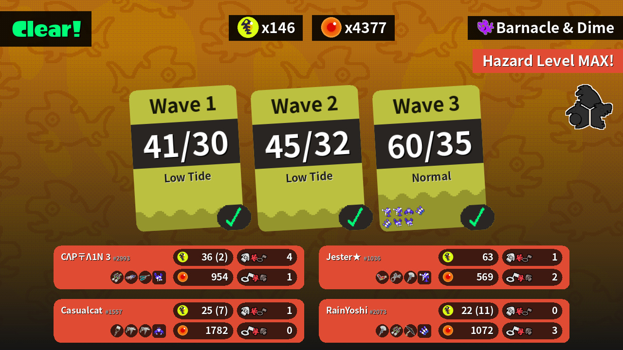 | Weapons | Splat Dualies Splattershot Pro Jet Squelcher | Hydra Splatling Aerospray MG Painbrush | Octobrush Grizzco Roller Grizzco Roller | Painbrush Splat Dualies Undercover Brella |