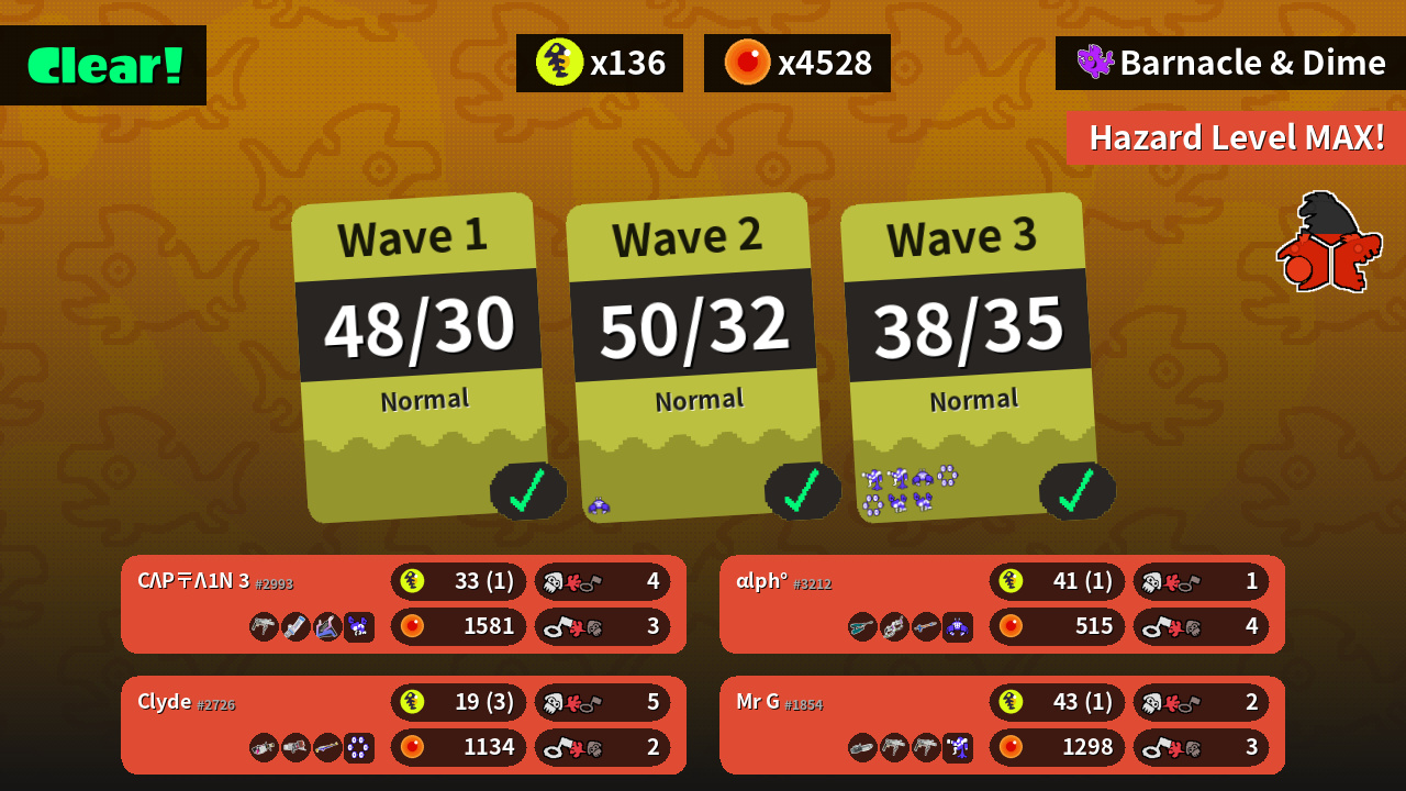 | Weapons | Grizzco Roller Mint Decavitator Slosher | Ballpoint Splatling Grizzco Roller Grizzco Roller | Jet Squelcher Dark Tetra Dualies Snipewriter 5H | .96 Gal Blaster Splat Charger |