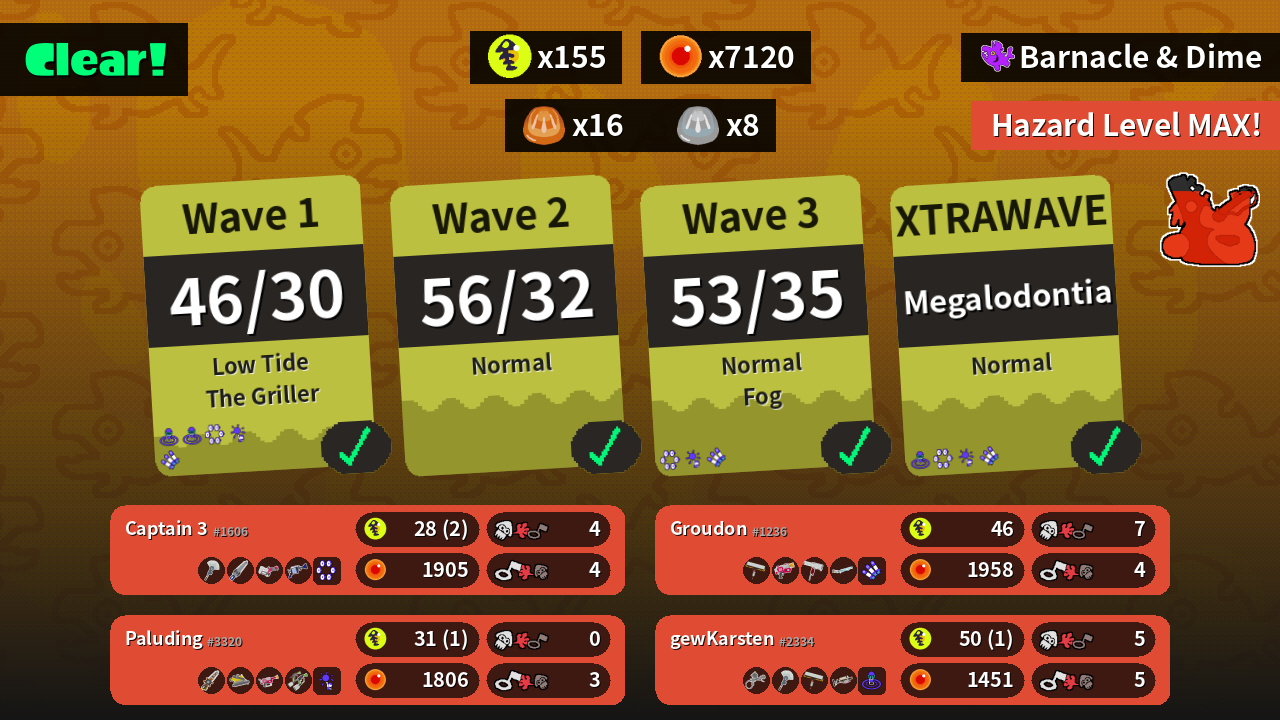 | Weapons | Painbrush Splatana Stamper Heavy Splatling H-3 Nozzlenose | Aerospray MG Painbrush Carbon Roller Grizzco Charger | Carbon Roller Rapid Blaster Flingza Roller Classic Squiffer | Grizzco Splatana Dread Wringer Rapid Blaster Pro Splat Dualies |