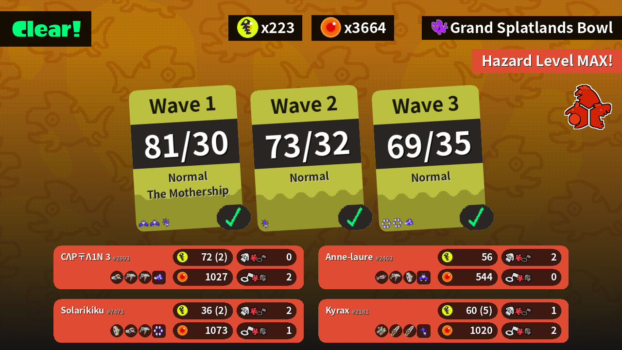 | Weapons | Grizzco Blaster Grizzco Roller Grizzco Roller | Grizzco Dualies Grizzco Splatana Grizzco Splatana | Grizzco Charger Grizzco Roller Grizzco Stringer | Grizzco Stringer Grizzco Blaster Grizzco Roller |