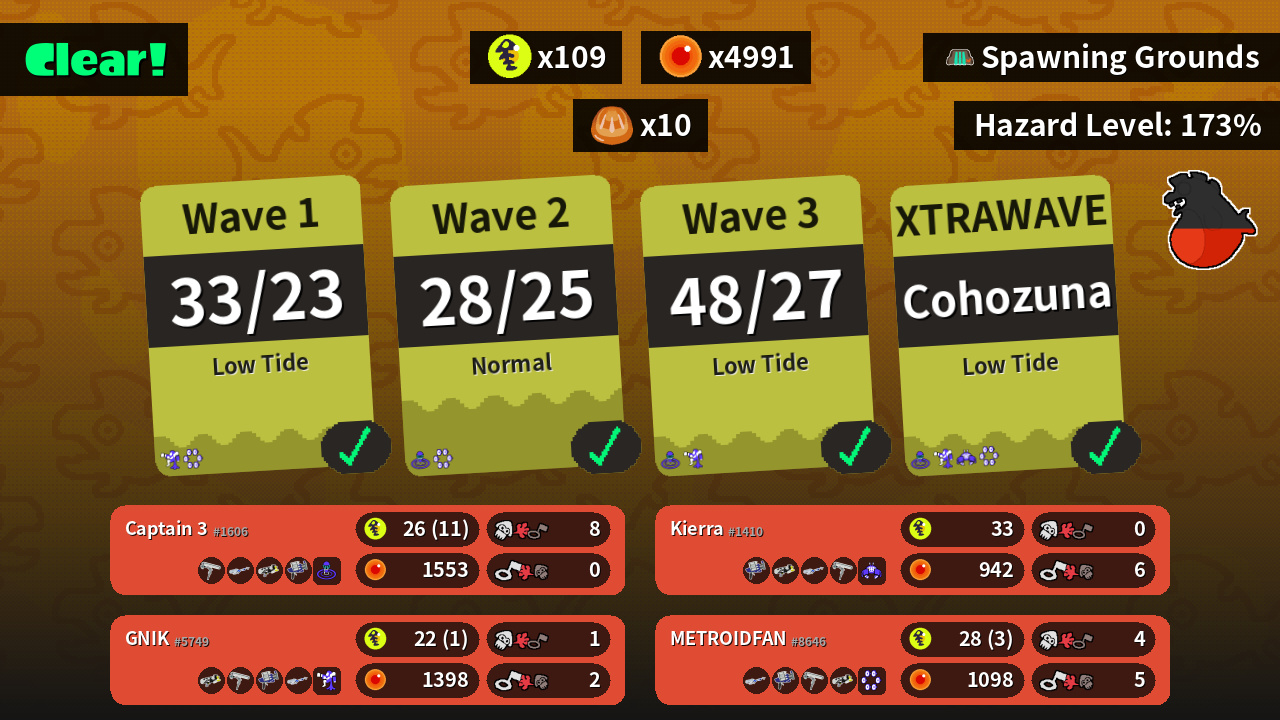 | Weapons | Dynamo Roller E-liter 4K Splattershot Nova Clash Blaster | Clash Blaster Splattershot Nova E-liter 4K Dynamo Roller | E-liter 4K Clash Blaster Dynamo Roller Splattershot Nova | Splattershot Nova Dynamo Roller Clash Blaster E-liter 4K |