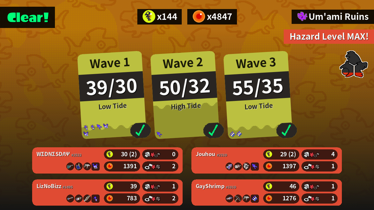 | Weapons | Jet Squelcher Tri-Slosher Grizzco Roller | Splattershot Pro Undercover Brella Grizzco Roller | Snipewriter 5H .96 Gal Splatana Wiper | Glooga Dualies Heavy Edit Splatling REEF-LUX 450 |