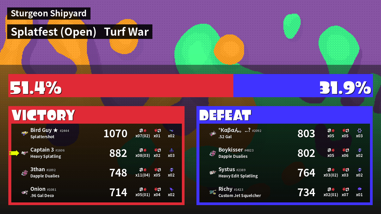 | Medals | #1 Wave Breaker User #2 Overall Splatter #2 Turf Inker | ||