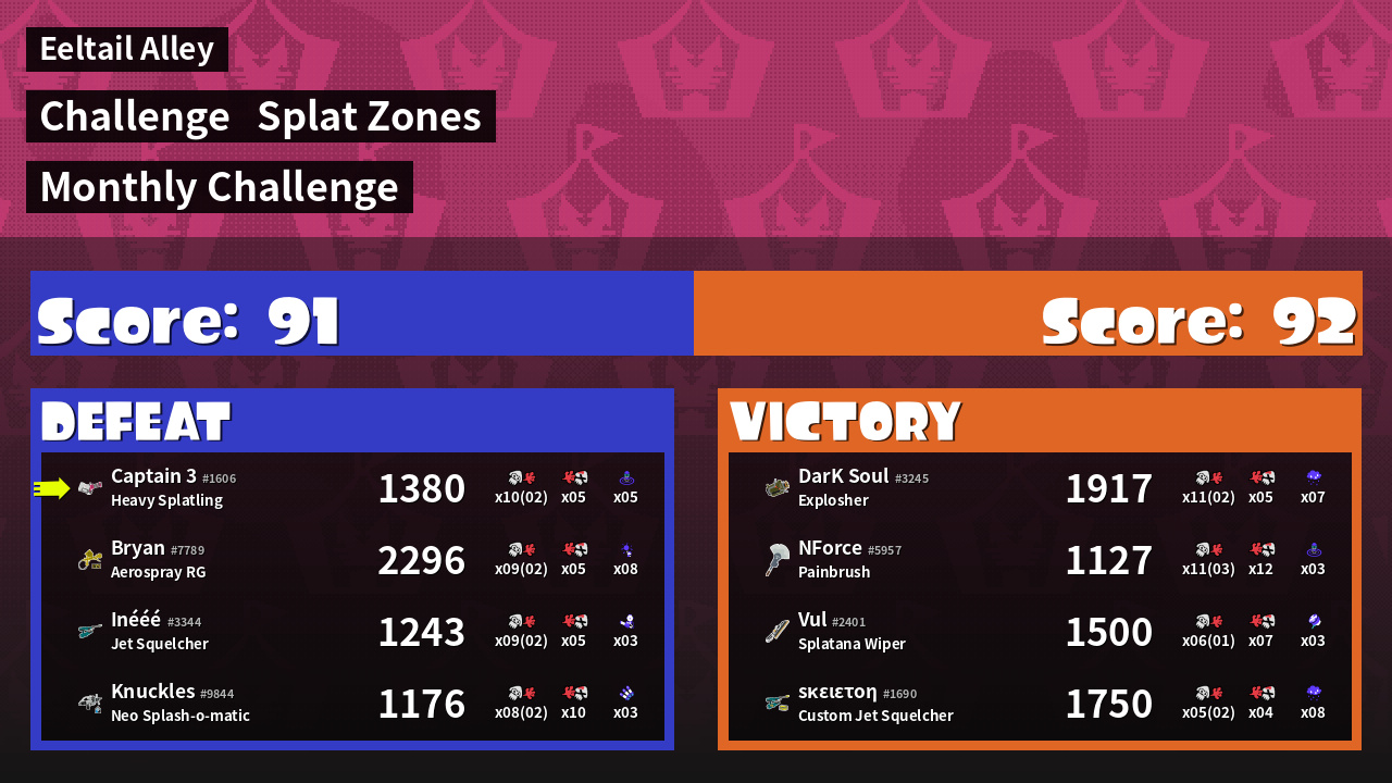 | Medals | #1 Overall Splatter #1 Splat Zone Guard #1 Popular Target | ||