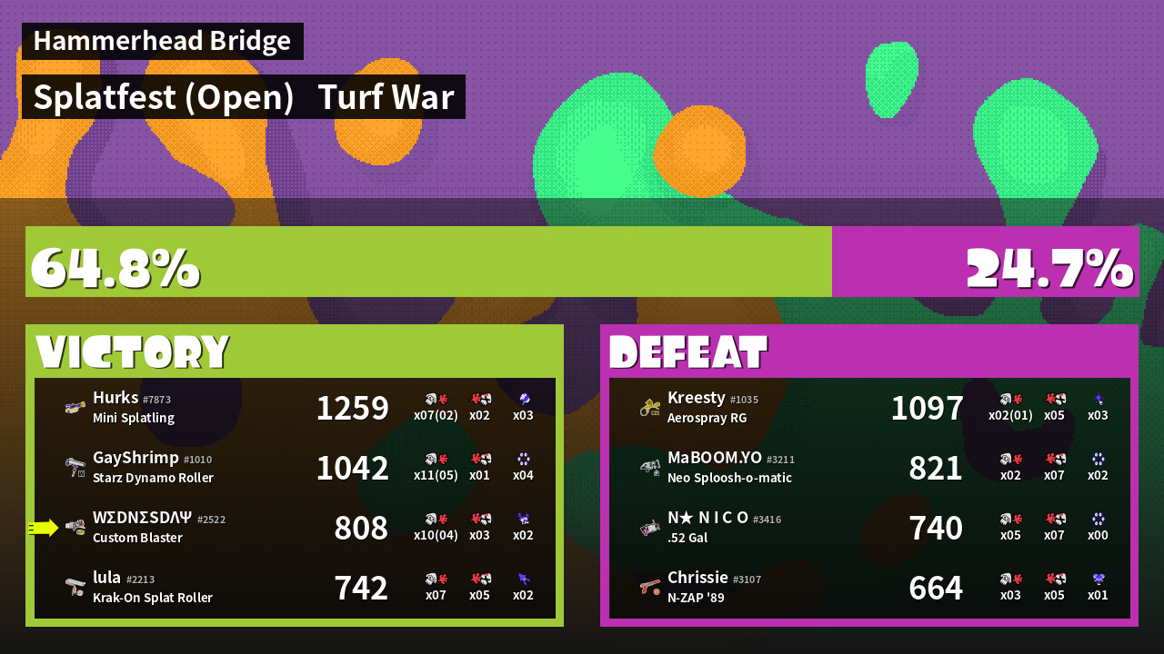 | Medals | #1 Enemy-Base Inker First Splat! #1 Triple Splashdown User | ||