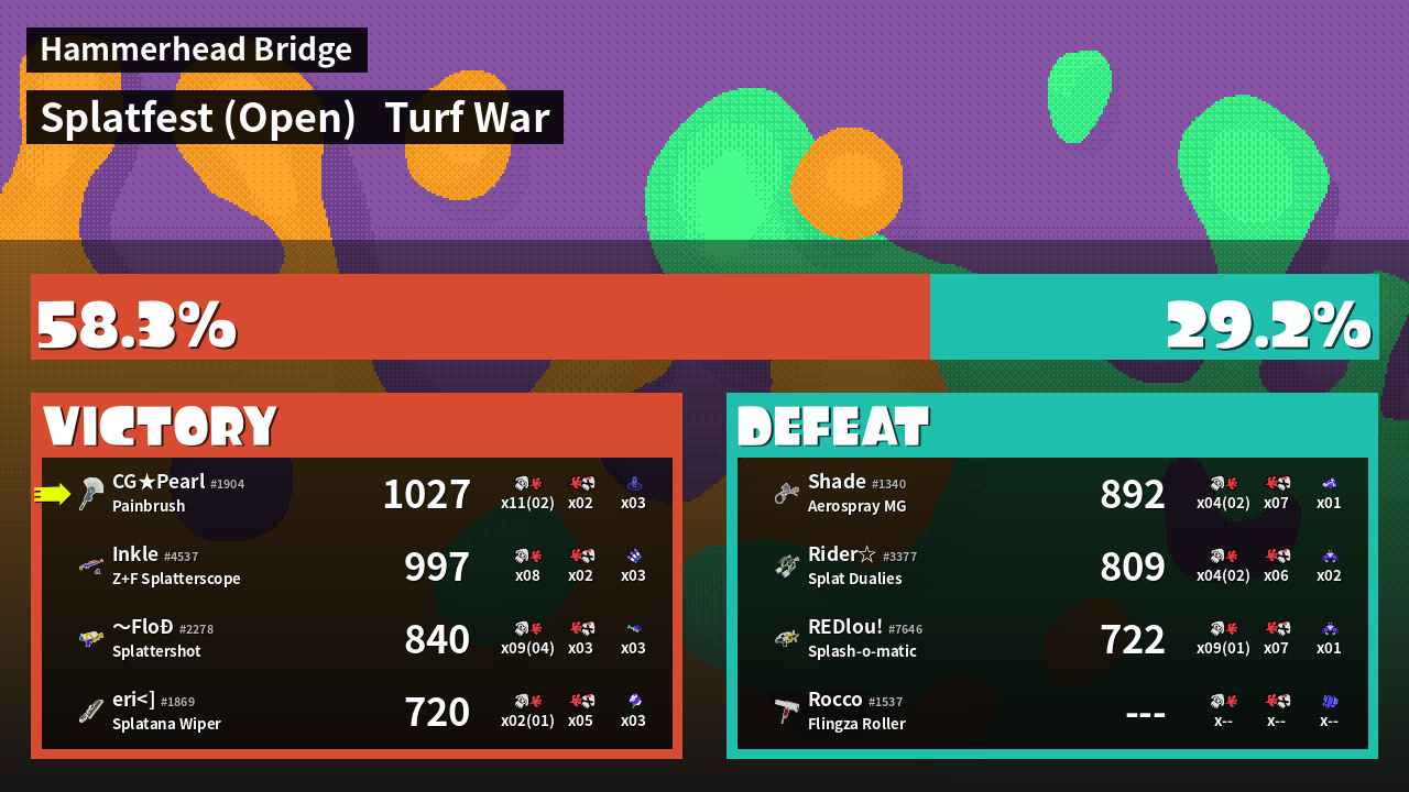 | Medals | #1 Overall Splatter #1 Turf Inker #1 Enemy Splatter | ||