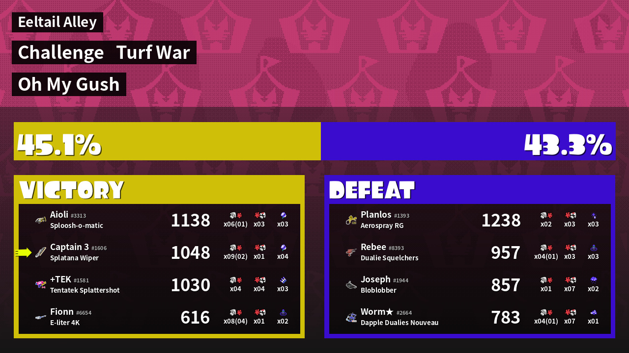 | Medals | #1 Overall Splatter #1 Enemy Splatter #1 Damage Taker | ||