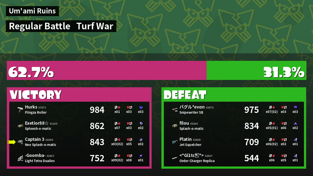 | Medals | #1 Super Jump Spot #1 Splat Assister #1 Ink Consumer | ||