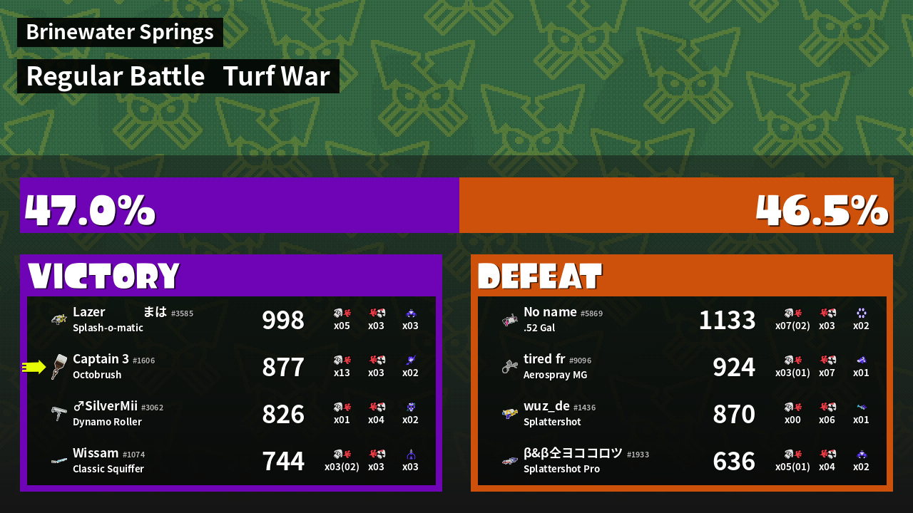 | Medals | #1 Overall Splatter #1 Popular Target #1 Enemy-Base Inker | ||