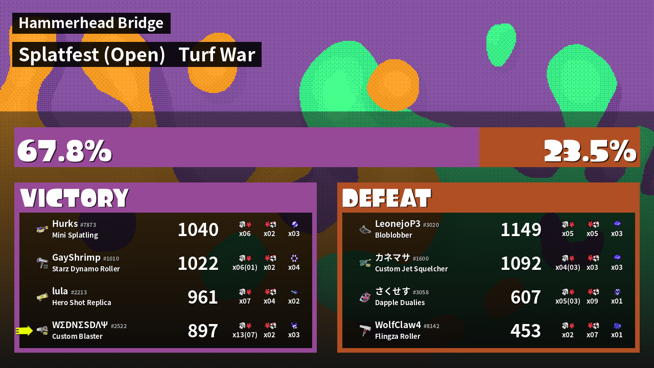 | Medals | #1 Overall Splatter #1 Popular Target #1 Enemy-Base Inker | ||
