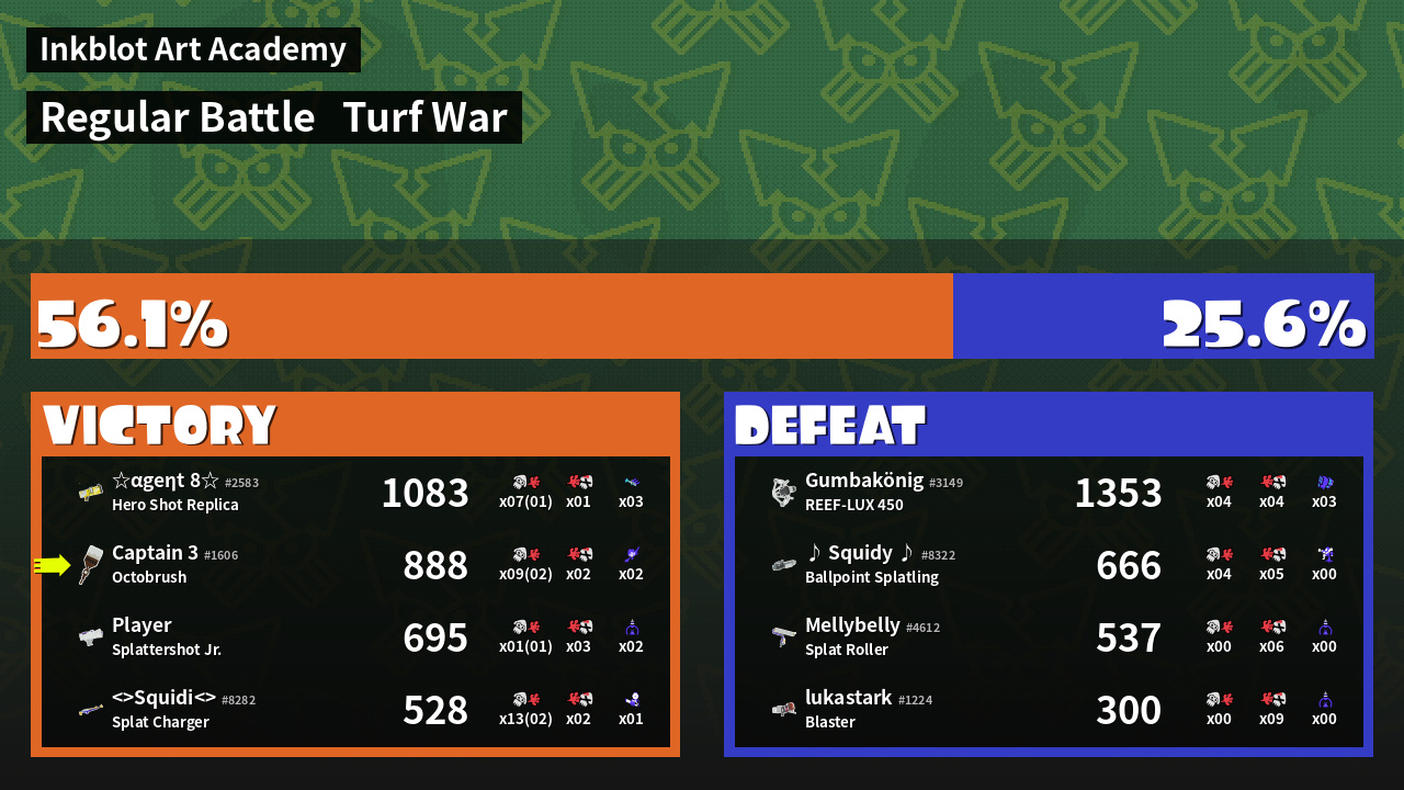 | Medals | #1 Enemy-Base Inker #1 Splat Assister #1 Ground Traveler | ||