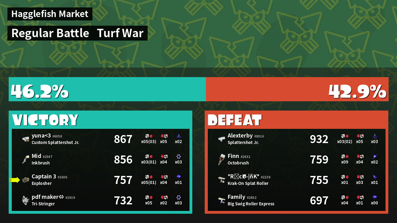 | Medals | #1 Overall Splatter #1 Popular Target #2 Enemy-Base Inker | ||