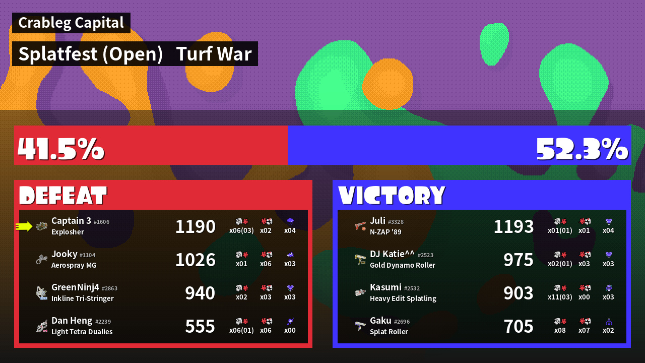 | Medals | #1 Overall Splatter #1 Turf Inker #1 Enemy-Base Inker | ||