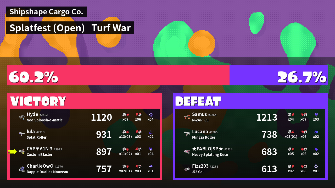 | Medals | #1 Ink Consumer #1 Triple Splashdown User #2 Overall Splatter | ||