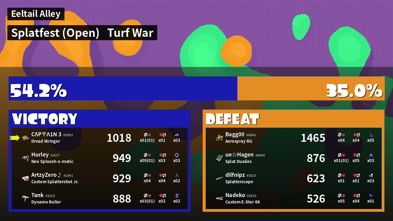| Medals | #1 Turf Inker #1 Splat Assister #1 Ground Traveler | ||
