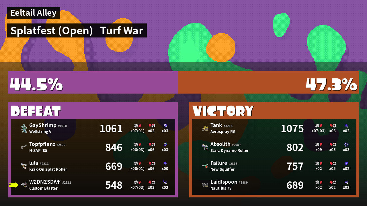 | Medals | #1 Overall Splatter #1 Popular Target #1 Splat Assister | ||