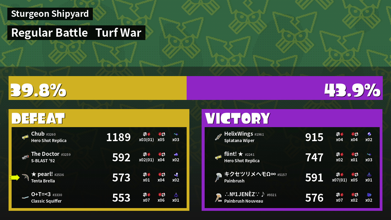 | Medals | #1 Damage Taker #1 Ink Vac User #2 Popular Target | ||