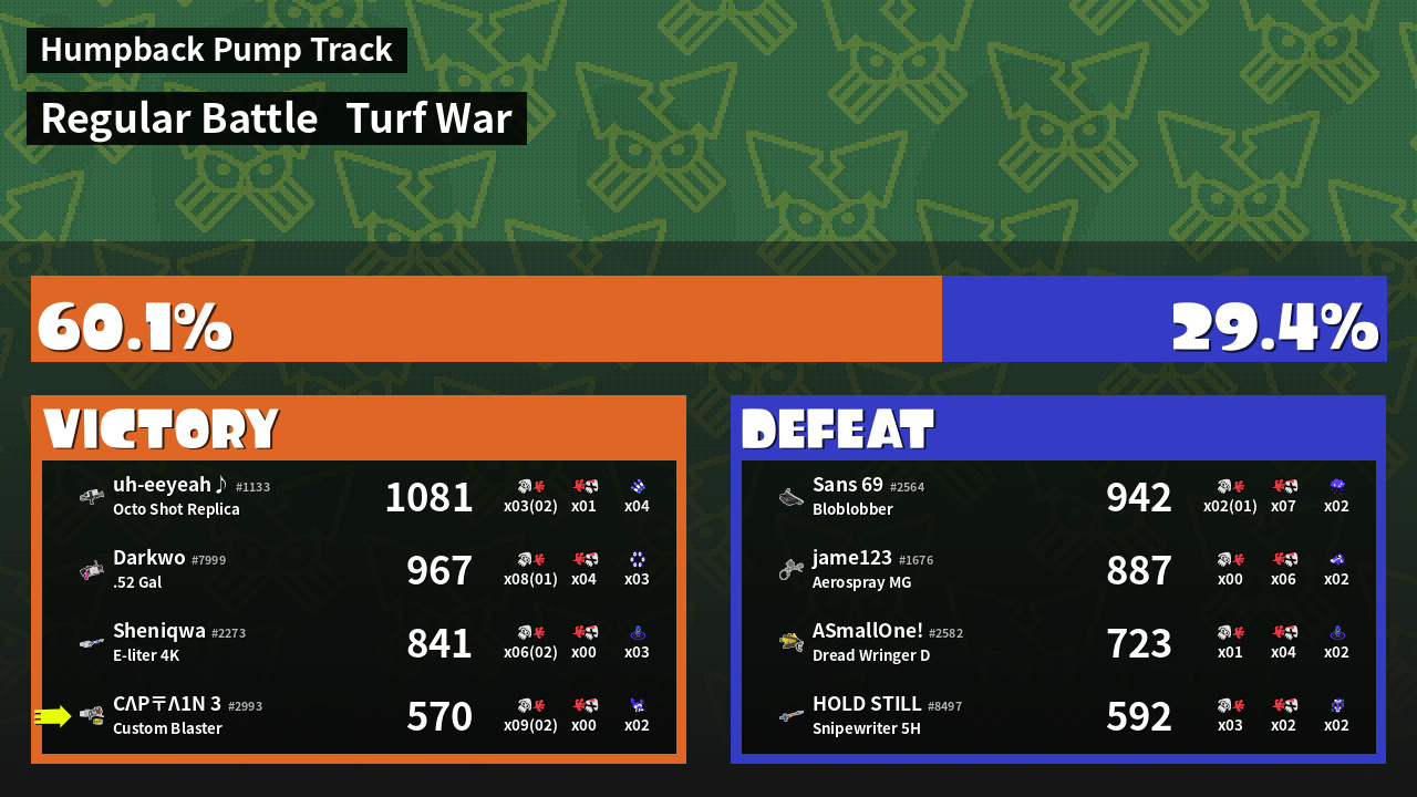 | Medals | #1 Overall Splatter #1 Enemy Splatter #1 Splat Assister | ||