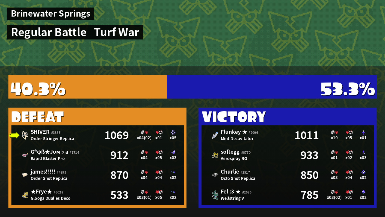 | Medals | #1 Overall Splatter #1 Turf Inker #1 Enemy-Base Inker | ||