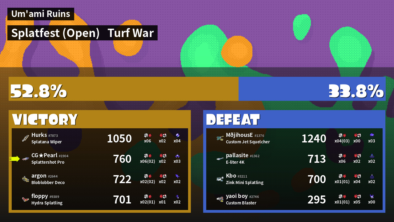 | Medals | #1 Overall Splatter #1 Splat Assister #1 Ink Consumer | ||
