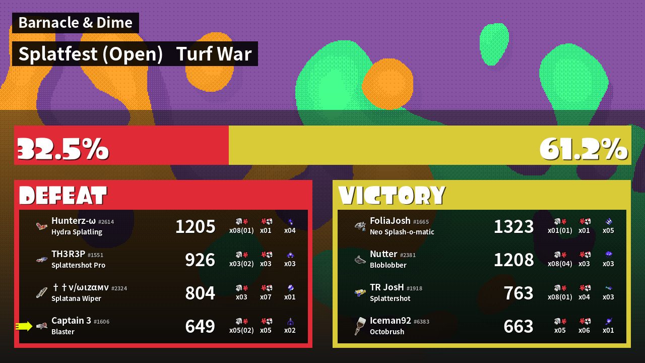 | Medals | #1 Splat Assister #1 Base Defender #1 Ink Consumer | ||