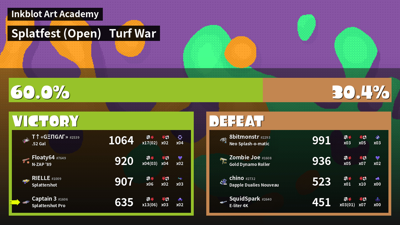 | Medals | #1 Splat Assister #1 Base Defender #1 Ink Consumer | ||