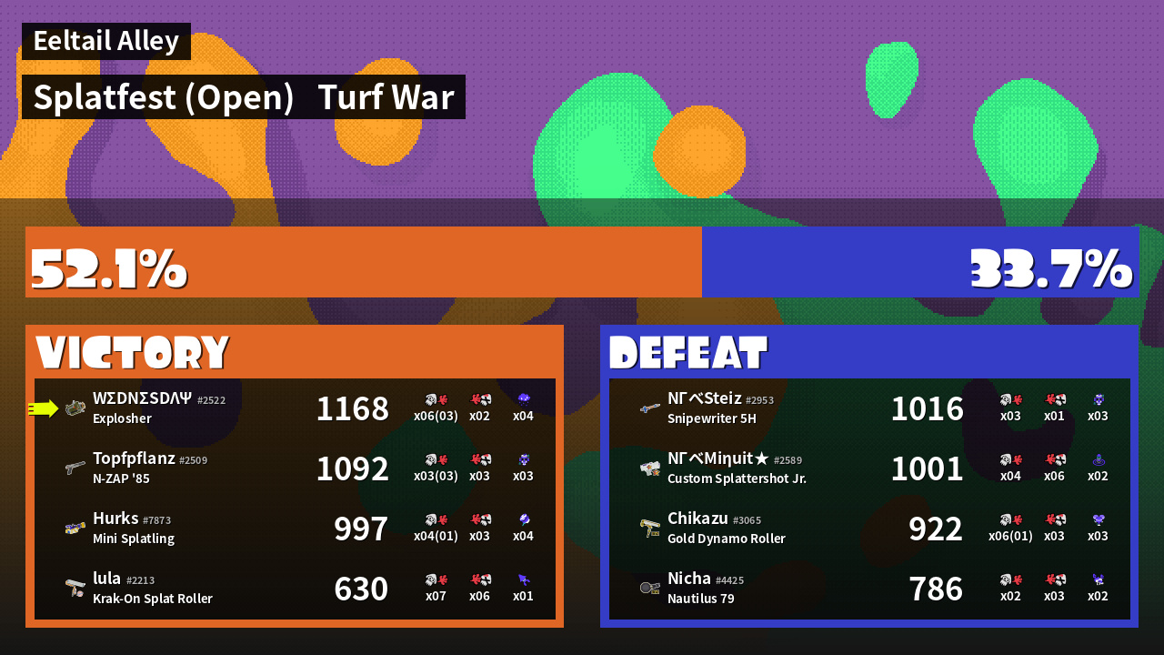 | Medals | #1 Turf Inker #1 Splat Assister #1 Damage Taker | ||