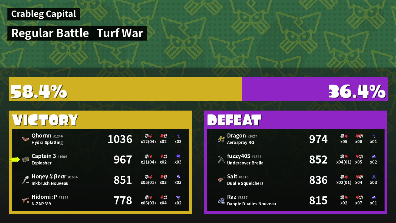 | Medals | #1 Popular Target #1 Enemy-Base Inker #1 Splat Assister | ||