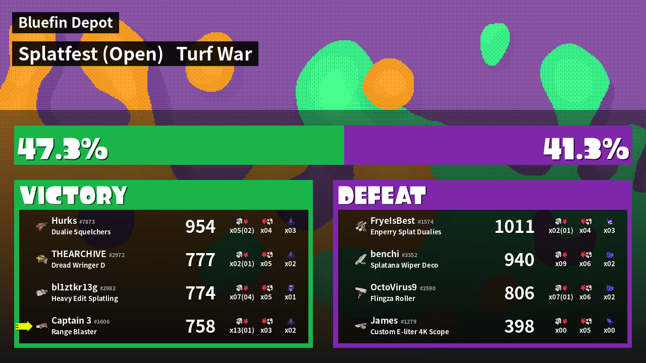 | Medals | #1 Overall Splatter #1 Enemy-Base Inker #1 Super Jump Spot | ||