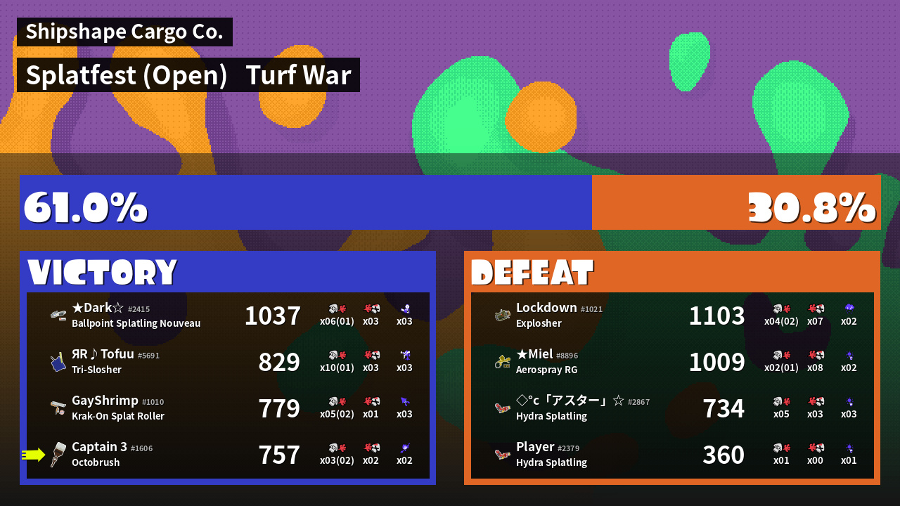 | Medals | #1 Enemy-Base Inker #1 Splat Assister #1 Ink Consumer | ||