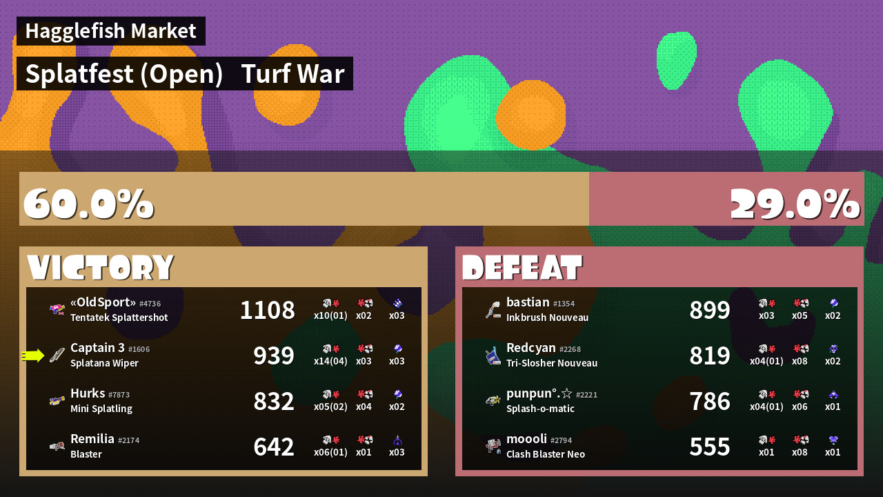 | Medals | #1 Overall Splatter #1 Enemy Splatter #1 Splat Assister | ||