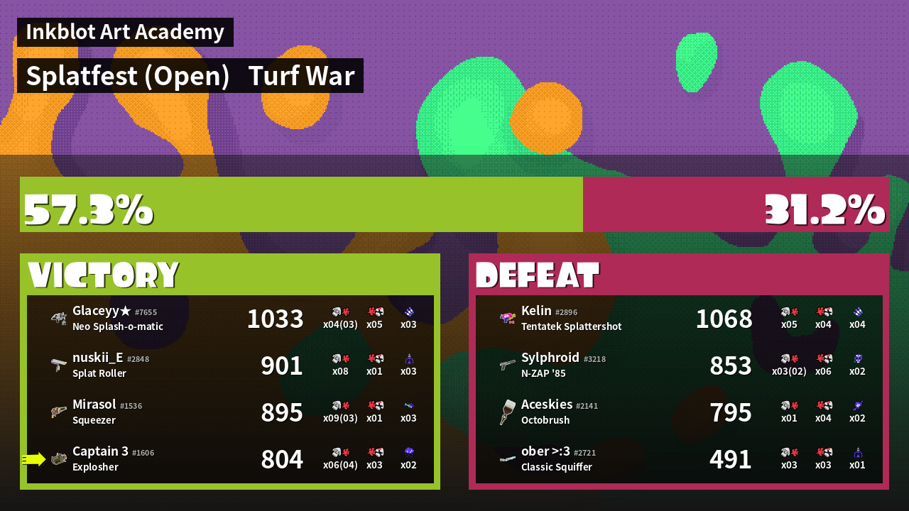 | Medals | #1 Splat Assister #1 Base Defender #1 Ink Consumer | ||