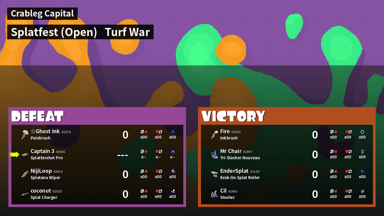 | Weapon | Splattershot Pro ( Angle Shooter / Crab Tank) | ||