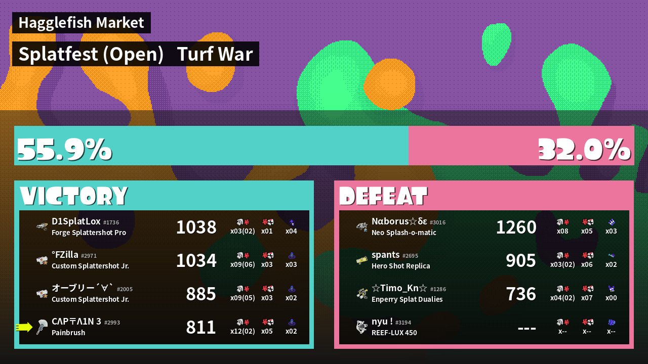 | Medals | #1 Overall Splatter #1 Enemy-Base Inker #1 Enemy Splatter | ||