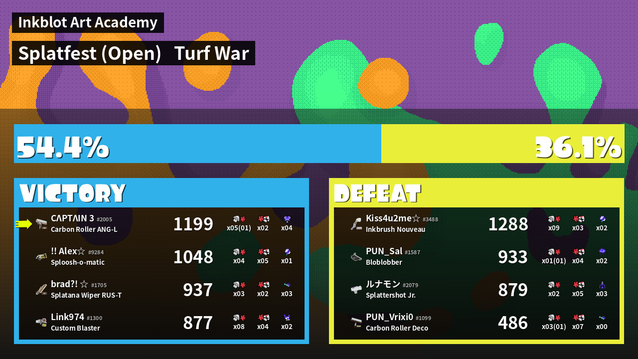 | Medals | #1 Turf Inker #1 Splat Assister #1 Ink Consumer | ||