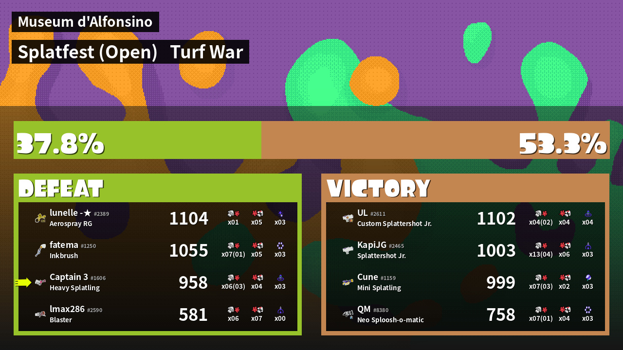 | Medals | #1 Splat Assister #1 Wave Breaker User #2 Overall Splatter | ||