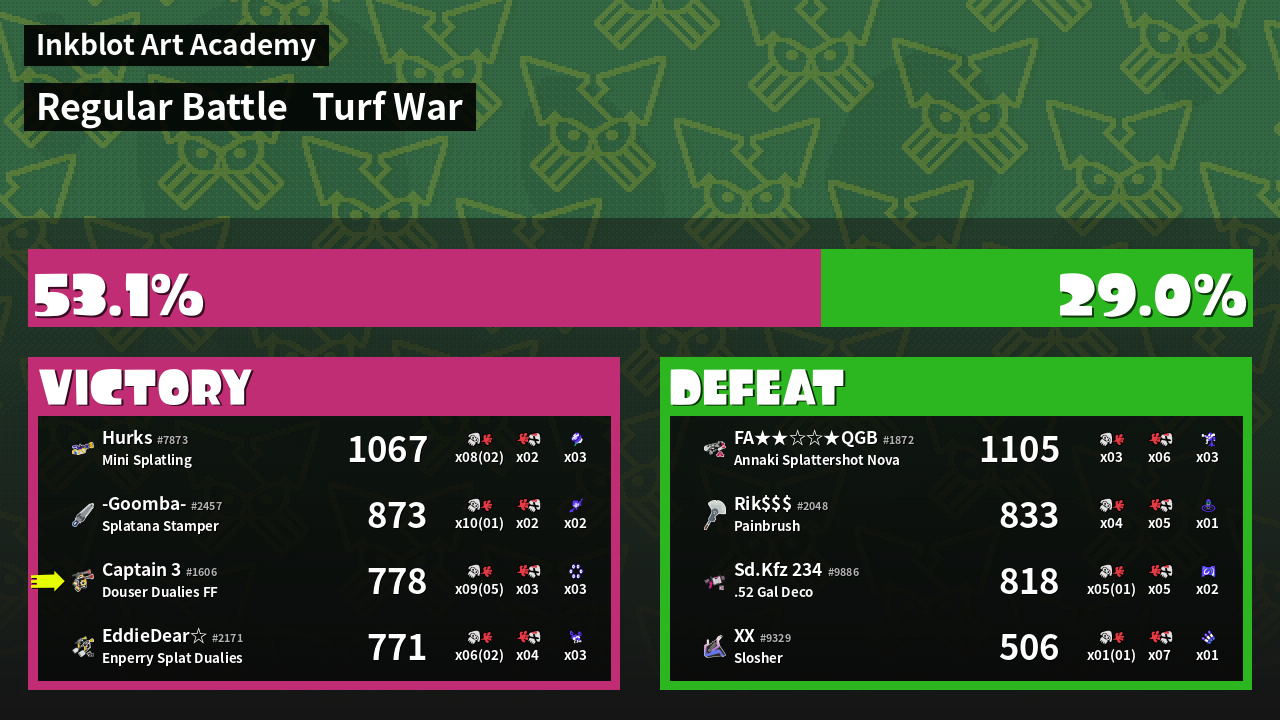 | Weapon | Douser Dualies FF ( Ink Mine / Killer Wail 5.1) | ||