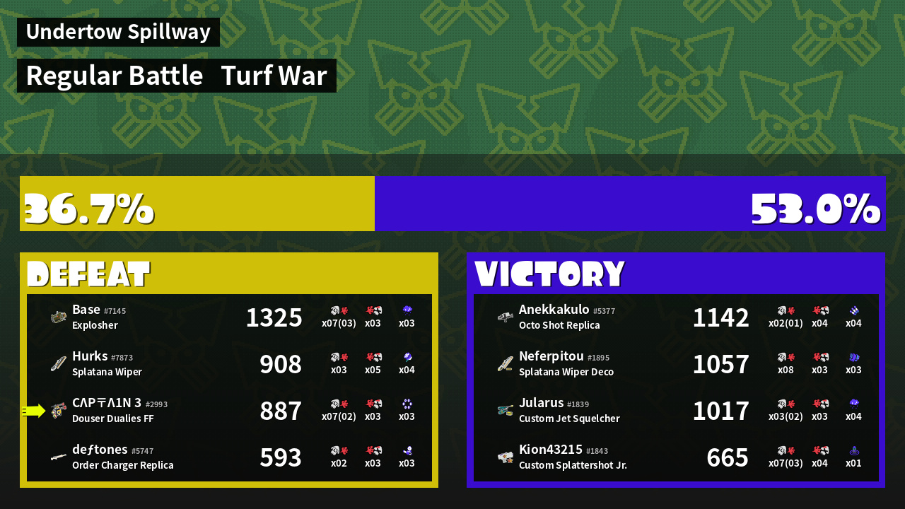 | Weapon | Douser Dualies FF ( Ink Mine / Killer Wail 5.1) | ||