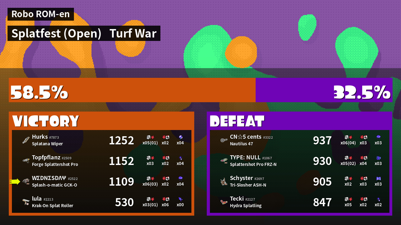 | Medals | #1 Overall Splatter #1 Enemy-Base Inker #1 Splat Assister | ||