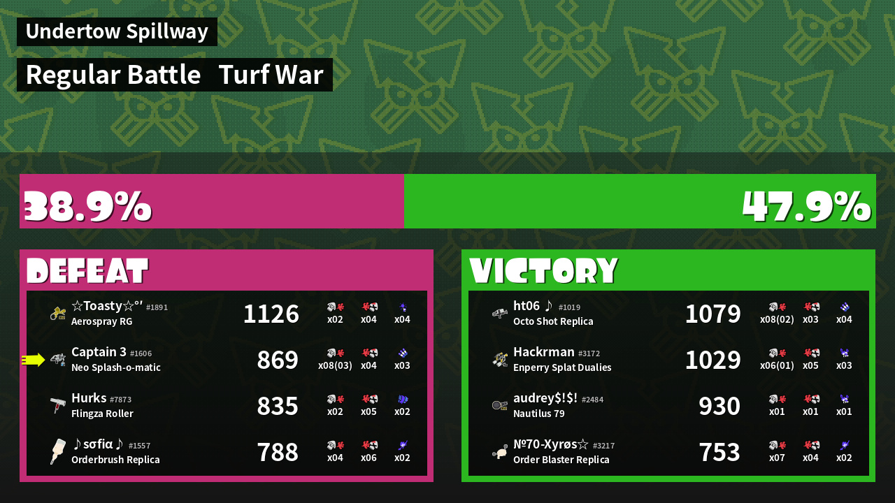 | Medals | #1 Overall Splatter #1 Popular Target #1 Enemy-Base Inker | ||